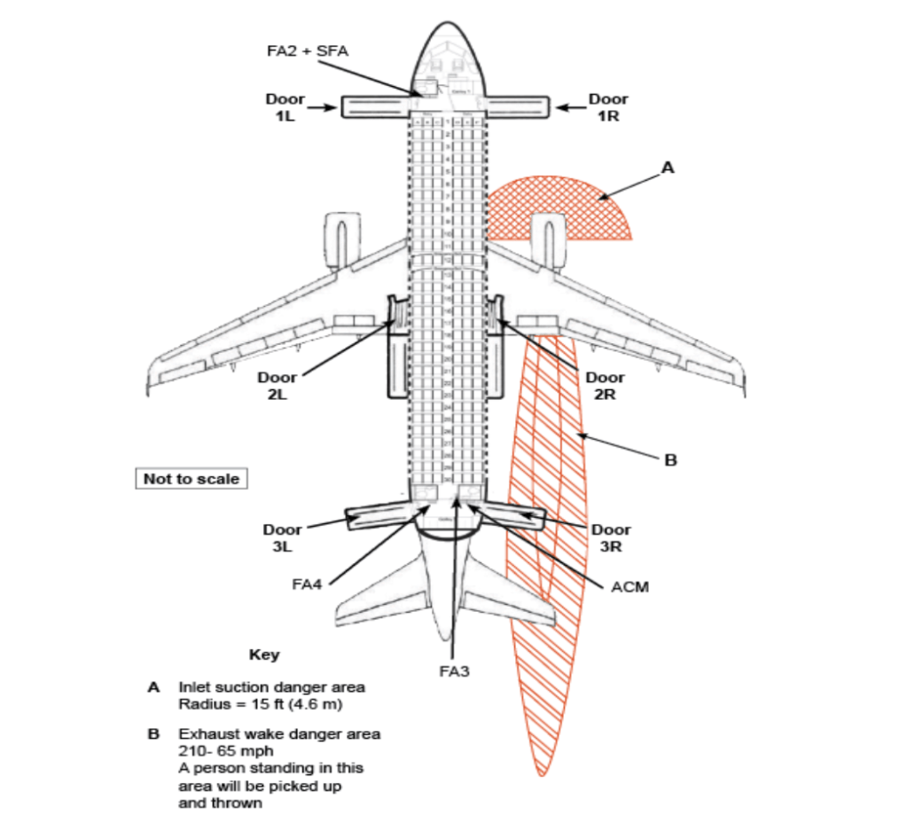 - Serious danger also to passengers disekmbarking using door 1R due to the suction area of the right engine.