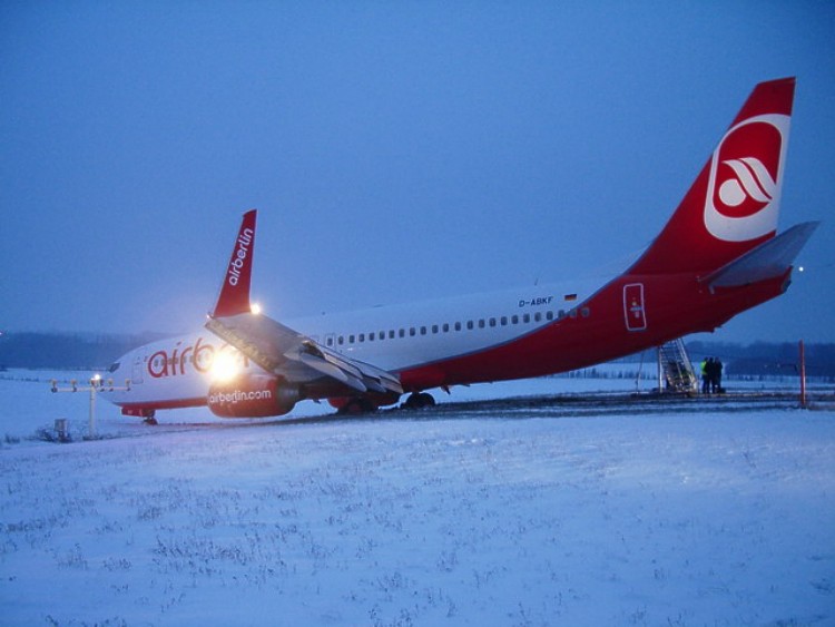 - Early morning, reduced visibilities, moderate snowfall, quartering headwind.